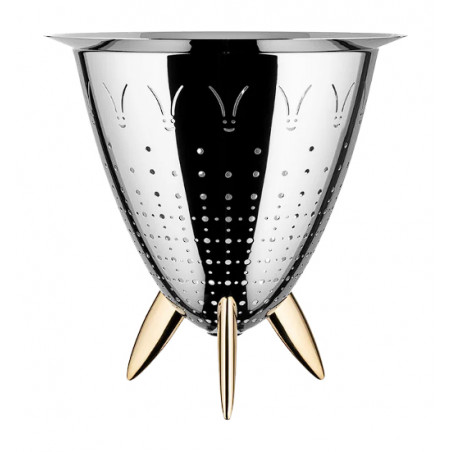 Cette passoire appartient à la collection **Max Le Chinois** de la maison **Alessi** et se distingue par son design singulier. Conçue en acier inoxydable, elle adopte une forme conique élégante, soutenue par trois pieds plats et coniques réalisés en laiton coulé finition or. Cette structure permet de la positionner aisément dans l’évier pour égoutter les aliments en toute simplicité. Les perforations, disposées selon un motif alternant trous larges et plus fins, assurent une évacuation efficace de l’eau. Des visages souriants décorent la partie supérieure, ajoutant une touche ludique et emblématique au design. Le rebord légèrement évasé facilite la prise en main, tandis que la surface lisse garantit un nettoyage aisé. D’un diamètre de 30 cm et d’une hauteur de 29 cm, cette passoire est une création signée **Philippe Starck**, mêlant fonctionnalité et esprit artistique.