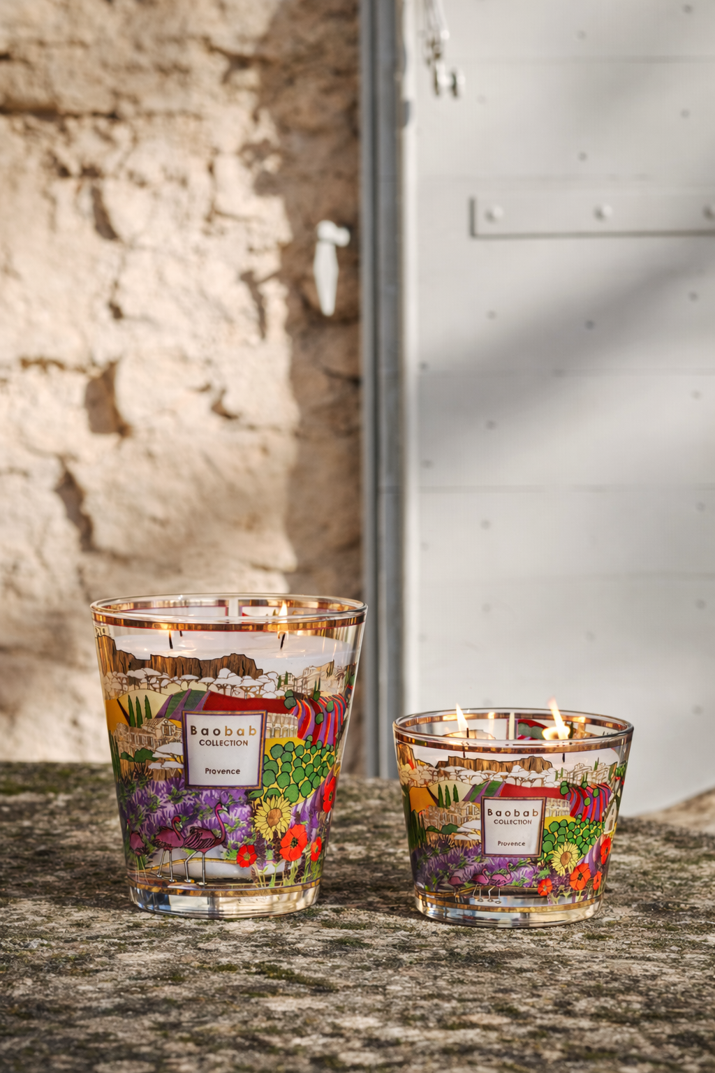 La Provence, c’est lavande, soleil, champs dorés à perte de vue. Fabrication à la main, verre soufflé, et une signature olfactive qui enveloppe tout.