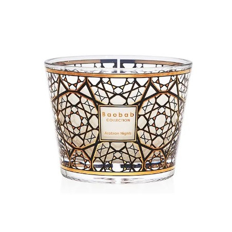 La bougie parfumée Arabian Nights nous transporte au cœur du monde mystérieux du Moyen-Orient. Son verre, délicatement sérigraphié à l’or 24 carats, s’inspire du célèbre moucharabieh, ces motifs ajourés emblématiques de l’architecture arabe, symboles de lumière, d’ombre et d’intimité.