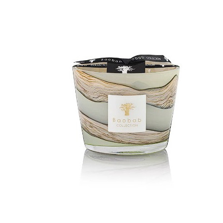 La bougie parfumée Sonora repose dans un flacon en verre soufflé à la main aux finitions exceptionnelles. Les couleurs s’entrelacent en lignes organiques, composant une véritable symphonie de teintes précieuses, du vert céladon aux subtiles nuances de bleu grisé.