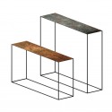 Console en deux hauteurs, en version ART. Structure en acier carré plein en 8 x 8 mm, peinture époxy noir cuivré sablé. Le plateau en tôle d’acier a subi un traitement rouille artistique qui lui confère de nombreuses nuance délibérément irrégulières, unique et hétérogène.