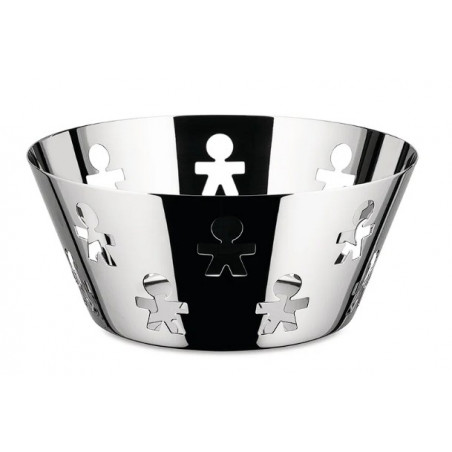 Le motif chantourné en forme de petits personnages, imaginé par Stefano Giovannoni et Guido Venturini sous le pseudonyme King-Kong, est appliqué à des objets du quotidien tels que le panier Girotondo en acier inoxydable. Ce décor ludique et immédiatement reconnaissable transforme un objet fonctionnel en une pièce de design emblématique. La production de ce modèle a débuté en 1993, marquant l’ancrage durable de cette collection dans l’univers du design contemporain