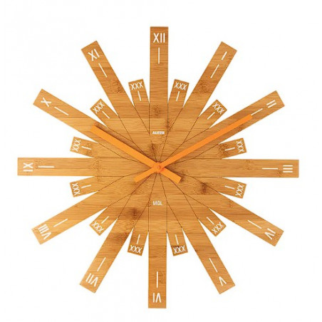 L’horloge murale Raggiante de Alessi est réalisée en bois de bambou et se distingue par son motif solaire expressif. Les douze longs rayons rectangulaires marquent les heures et évoquent un soleil « raggiante », c’est-à-dire radieux. Entre eux, douze rayons plus courts complètent la composition, tandis que les aiguilles teintées d’un orange vif viennent parfaire cette représentation lumineuse. Imaginée par Michele De Lucchi, cette horloge s’inspire directement du soleil, premier repère naturel du temps. Source de lumière et de rythme quotidien, il structure nos journées du matin au soir. Raggiante est pensée comme un objet qui éclaire le mur autant par sa présence que par son symbolisme, agréable à contempler à tout moment : autour d’un repas, depuis un fauteuil ou dès l’entrée dans la maison. Une horloge chaleureuse, presque solaire, qui diffuse une douce énergie dans l’espace