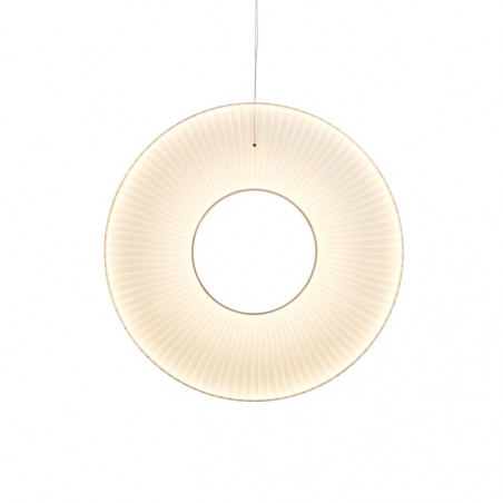 64407 Avec sa forme originale, la suspension Iris impose de nouveaux volumes et proportions avec une grande élégance. Elle se compose d’un grand disque lumineux troué en son centre. Très raffiné, ce disque est recouvert de tissu blanc plissé. Les deux faces du disque sont identiques et lumineuses ce qui permet un éclairage recto verso. Iris propose un superbe jeu d'ombre et de lumière grâce aux différences d'épaisseur du tissu au niveau des plis. Le rendu est splendide : vivante, vibrante, douce et chaleureuse, la lumière semble s'animer de mouvement.