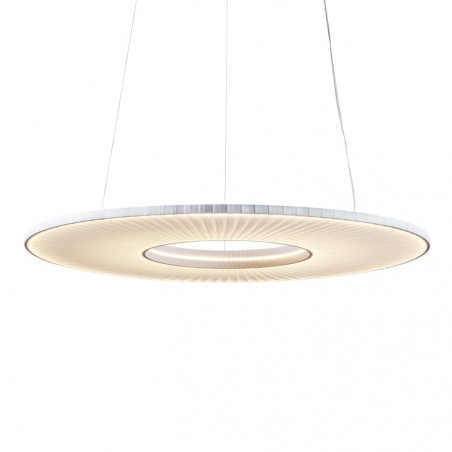 Avec sa forme originale, la suspension Iris impose de nouveaux volumes et proportions avec une grande élégance. Elle se compose d’un grand disque lumineux troué en son centre. Très raffiné, ce disque est recouvert de tissu blanc plissé. Les deux faces du disque sont identiques et lumineuses ce qui permet un éclairage recto verso. Iris propose un superbe jeu d'ombre et de lumière grâce aux différences d'épaisseur du tissu au niveau des plis. Le rendu est splendide : vivante, vibrante, douce et chaleureuse, la lumière semble s'animer de mouvement.