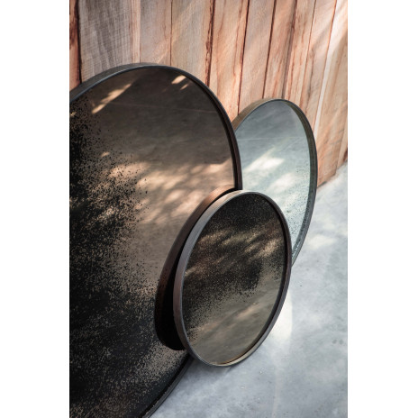 Ce miroir rond en bronze très vieilli se trouve à mi-chemin entre une pièce d’art et fonctionnelle. Qu'il s'agisse d'orner le salon ou de remplir une fonction pratique dans une salle de bains ou un dressing, cette pièce unique remplit sa fonction avec une touche artistique.
