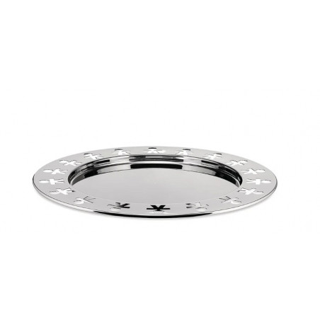Le motif chantourné en forme de petits personnages, imaginé par Stefano Giovannoni et Guido Venturini sous le pseudonyme King-Kong, est appliqué à des objets du quotidien, comme le plateau Girotondo en acier inoxydable. Ce décor iconique apporte une touche ludique et immédiatement reconnaissable à un objet fonctionnel, devenant une véritable signature du design Alessi. La production de ce modèle a débuté en 1989, marquant la naissance d’un motif devenu emblématique