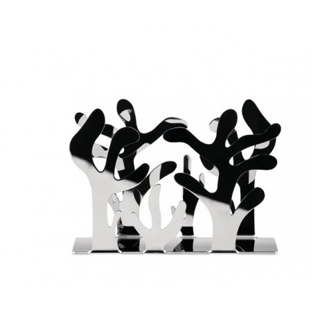 Après le succès retentissant de la corbeille à fruits Mediterraneo, présentée en 2006, la collection s’est enrichie de nouveaux accessoires de table pour le plus grand plaisir des amateurs de design : porte-rouleau de cuisine, porte-serviettes en papier, fixe-nappe, ronds de serviette et photophore. Imaginée par la créatrice de bijoux Emma Silvestris, cette collection célèbre le corail en transposant dans le métal découpé l’aura symbolique qui accompagne cette matière précieuse depuis l’Antiquité. Le jeu subtil entre pleins et vides des lignes ajourées confère à chaque pièce une élégance raffinée et poétique