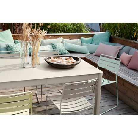 Ribambelle XL, c'est la table en métal la plus modulable du marché ! Élégante à 6, 8, 10, 12 ... et jusqu'à14 personnes, elle ne peut mieux porter son nom. Et si elle peut passer de 149 cm à 299 cm de long, c'est qu'elle est munie de 3 allonges de 50 cm de large qui sont très simples d'utilisation. Ses traverses et sa construction par un système de glissière et de roulement lui confèrent une solidité à toute épreuve, quelle que soit sa configuration. Tout en aluminium, cette table de jardin est très stable et résistante aux conditions extérieures avec ses larges pieds, sa structure épaisse et un plateau ultra fin de 3 mm : un contraste très esthétique, ravivé par la couleur. Et parce que les allonges ont le bon goût de se faire discrètes, logées dans un coffret de rangement dissimilé sous le plateau, Ribambelle XL garde son allure, avec ou sans allonge. On module à volonté pour pouvoir rajouter des invités à tout moment de la journée et on craque pour son design contemporain.